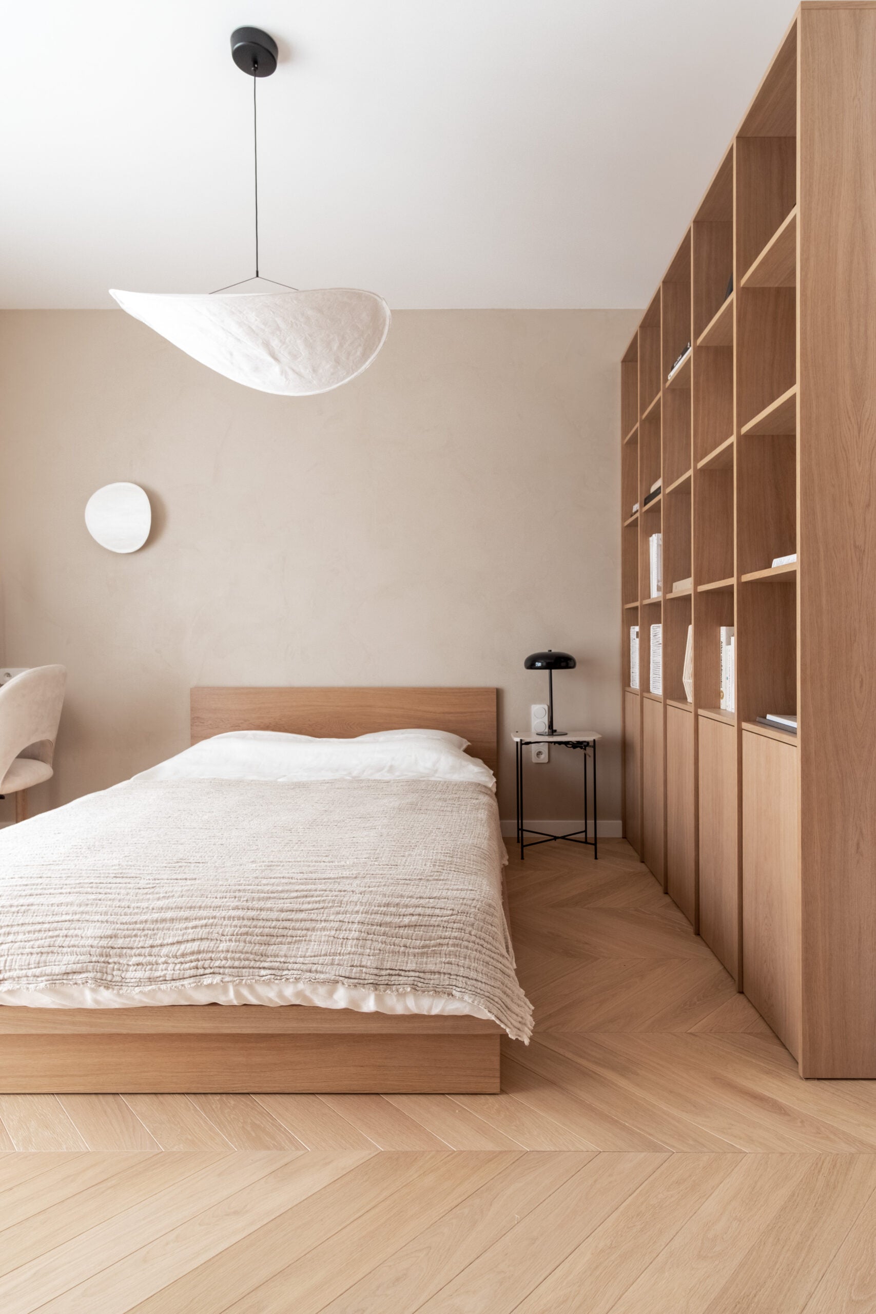 “It is set off by a bright lamp and a simple bed headboard,” she adds. “Thanks to the abrasion effect, which is one of several options for applying this material, the wall has become a painterly background and a complement to the entire interior.”