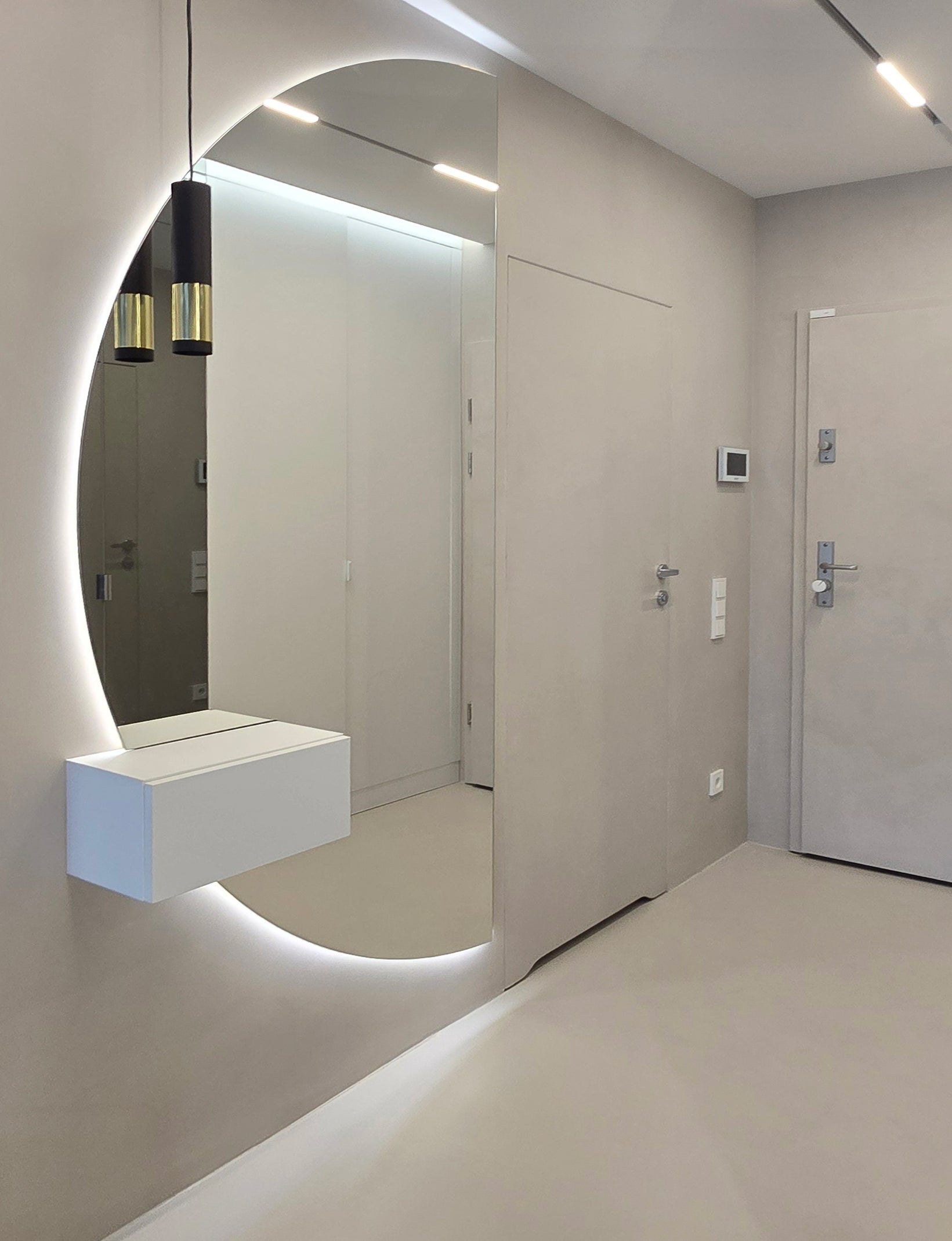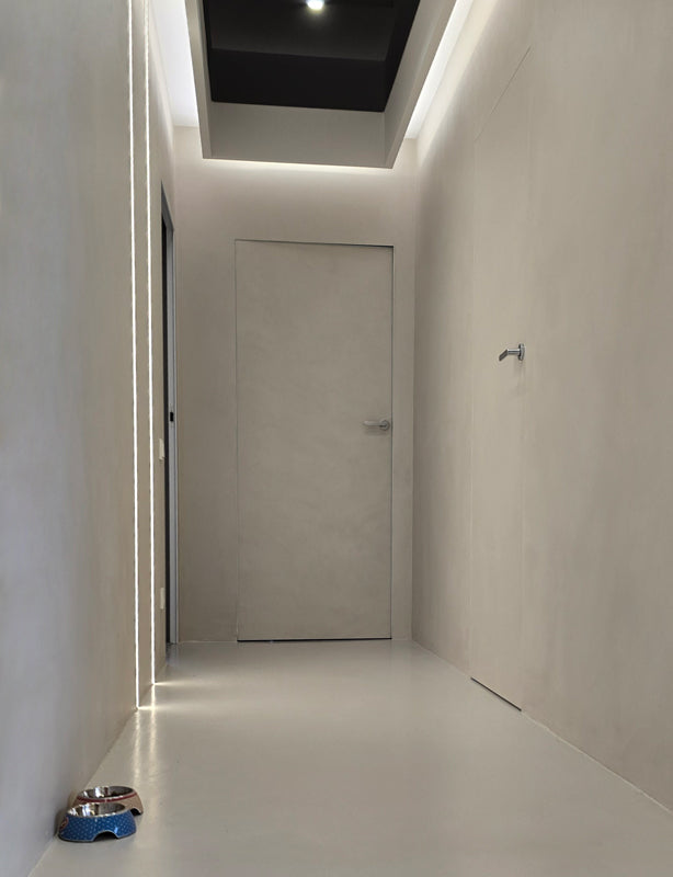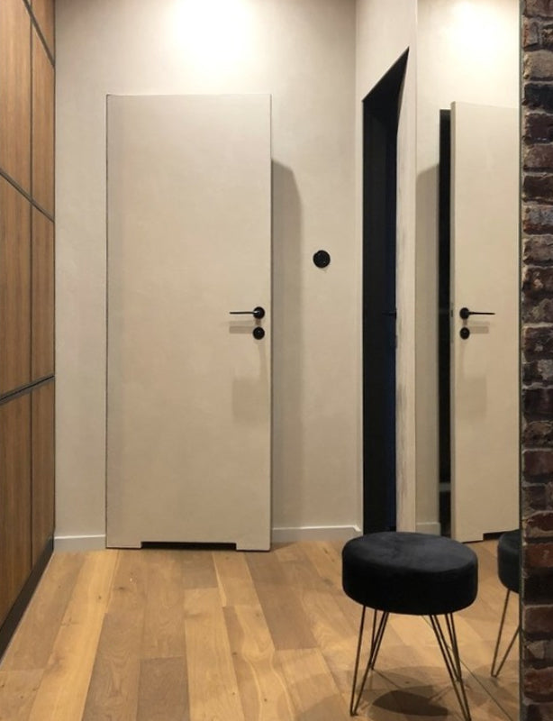 One of our clients, Mrs. Kinga, is a huge fan of microcement, which is why she finished the whole house with microcement (floors, wall in the kitchen, ceiling in the bathroom, fireplace, stairs). At the end she also asked the installers to cover one of the doors with microcement. They created  door with hidden frame forming a uniform surface with microcement wall. A flush door is an innovative solution that allows you to creatively design the interior, fully adjust the arrangement of the apartment to our needs.  A flush door consists of skeleton or a hollow framework of rails and stiles, top and bottom rails, and narrow intermediate rails. It is covered on each side by a sheet of plywood. This door has a joint-less surface on both the sides.invisible. Such doors give unlimited possibilities to arrange the surface finish of the wing – using paint, wallpaper or decorative plaster Microcement can be applied on the door similarly to other surfaces. At the beginning, door should be sanded gently in order to tarnish the surface and get better grip. Then it should be covered with a primer and  two layers of microcement should be applied. At the end, the surface is sanded and covered with microcement sealer. Microcement doors are not difficult to make, but they require a bit of precision and attention to detail. Special care should be taken when finishing corners and edges. Such concrete-like doors are chic, durable, resistant to damage and easy to clean.