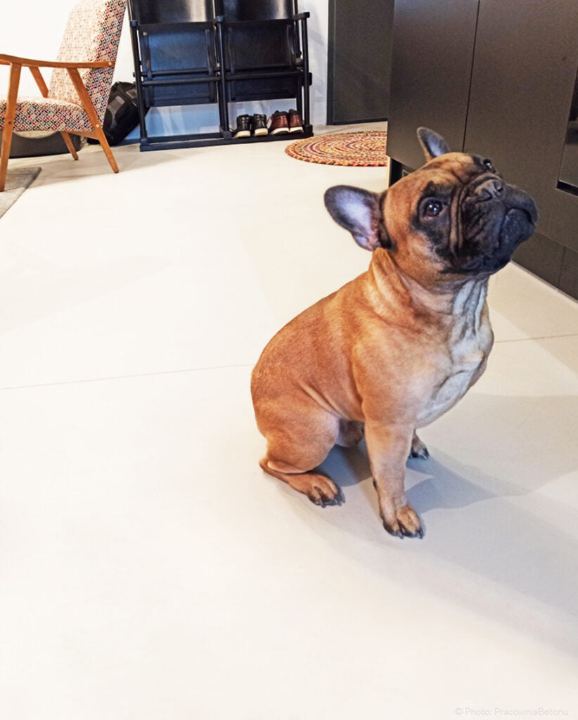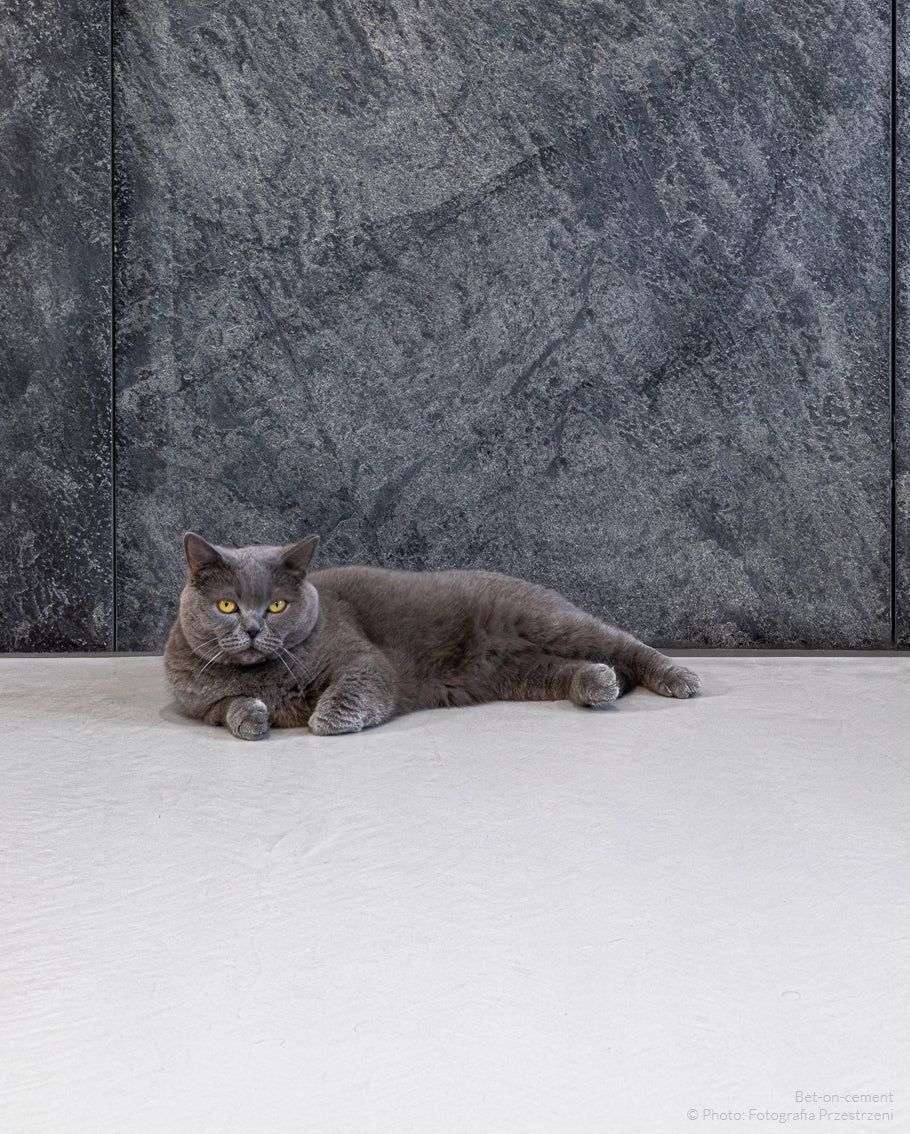 Another advantage of microcement is that it is easy to keep clean. Its smooth surface allows any dirt, such as hair, fur, mud marks or food residues, to be removed quickly and easily. The microcement is also waterproof, meaning that it does not absorb moisture or smells, which is extremely important in homes with pets. As a result, there is no need to worry about unpleasant odours or surface stains that can occur with other materials.
