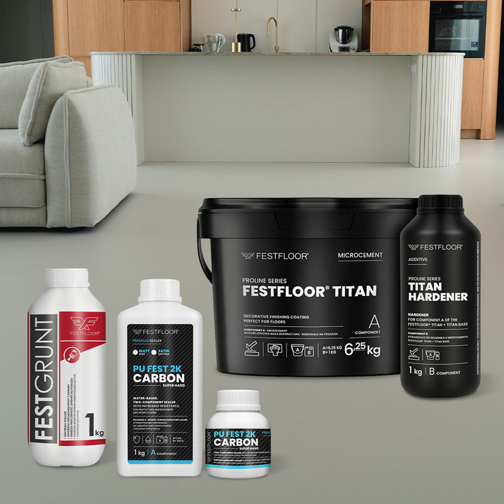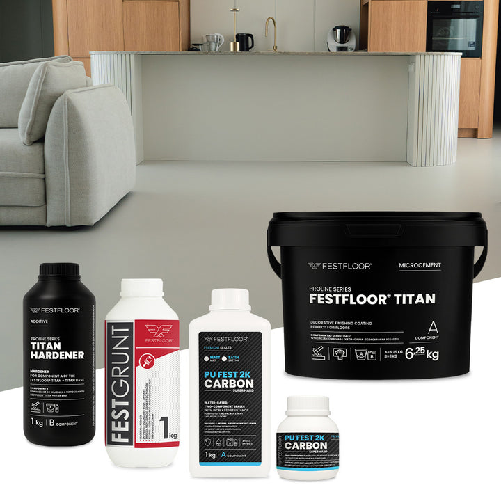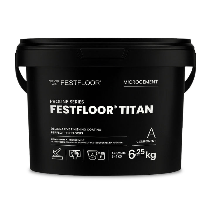 FESTFLOOR TITAN Microcement (6.25 kg) + TITAN HARDENER (1 kg) – a two-component epoxy-based system that ensures exceptional hardness and resistance. Perfect for heavily used surfaces. The product is sufficient for two coats.