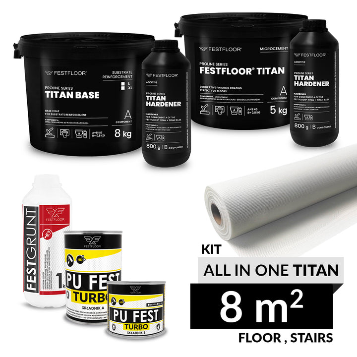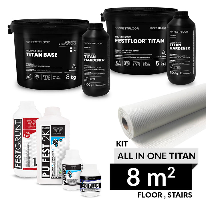 ALL IN ONE TITAN is a comprehensive set of products for making an extremely durable and resistant microcement floor of 8 m². It is a recommended set in the FESTFLOOR TITAN system, dedicated to surfaces exposed to intensive use, such as floors in offices, apartments and commercial spaces, as well as stairs or countertops. The set is also ideal for areas subject to intensive use, providing high resistance to damage and abrasion.