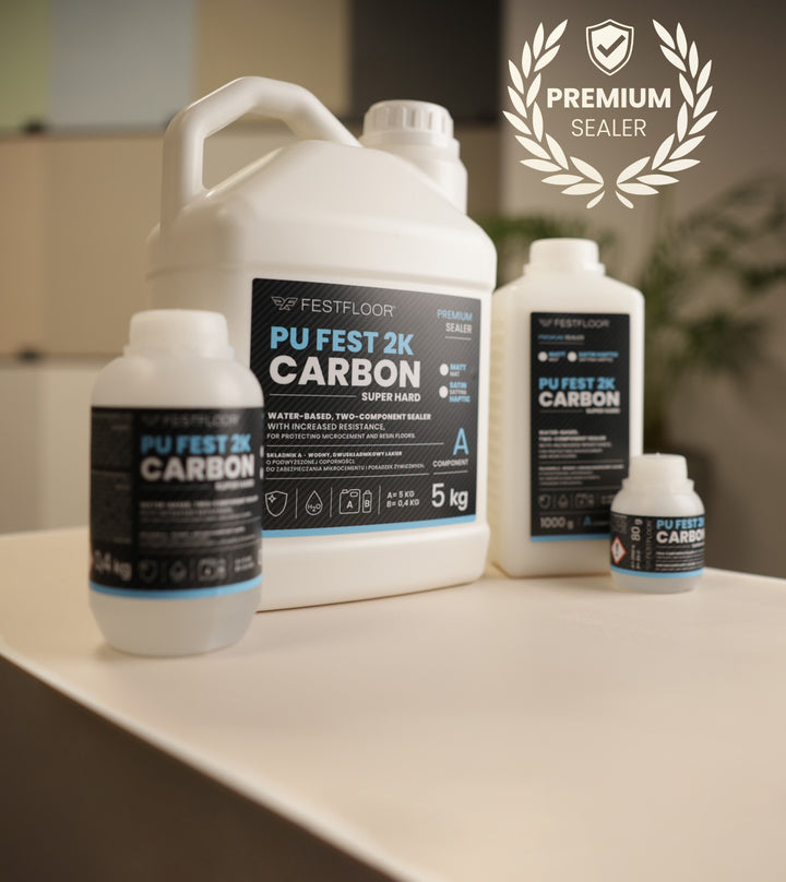 PU FEST 2K CARBON is a two-component, water-based sealer with enhanced durability, designed specifically for protecting surfaces made of microcement, as well as epoxy and polyurethane resins. Thanks to its polycarbonate-reinforced formula, it offers increased resistance to scratches, damage, and staining. PU FEST 2K CARBON creates an exceptionally hard yet flexible protective layer.